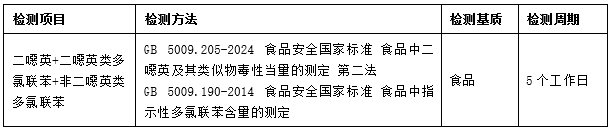 检测方法:GB 5009.205-2024《食品中二噁英及其类似物毒性当量的测定》、GB 5009.190-2014《食品安全国家标准 食品中指示性多氯联苯含量的测定》