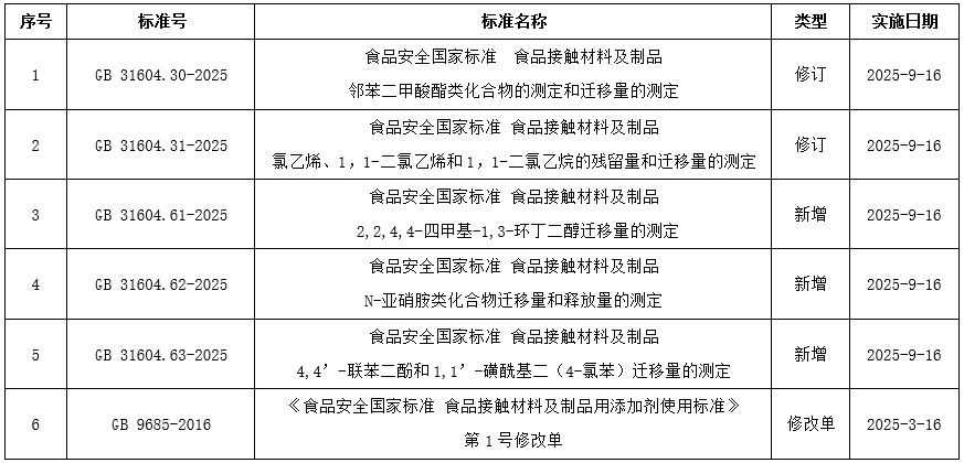 2025年3月27日,国家卫生健康委和国家市场监管总局联合发布2025年第2号公告,新发布50项食品安全国家标准和9项修改单,其中包含5项食品接触材料标准和1项食品接触材料标准修改单。
