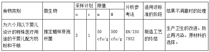 欧盟:根据委员会条例(EC)第1441/2007号,为六个月以下婴儿设计的特殊医疗用途的干婴儿配方奶粉和干辅食设定了蜡样芽孢杆菌标准。
