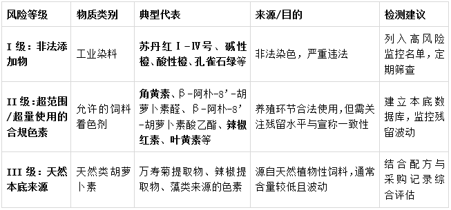 禽蛋颜色相关风险远不止角黄素一个,作为检测机构,我们建议企业关注以下三级风险: